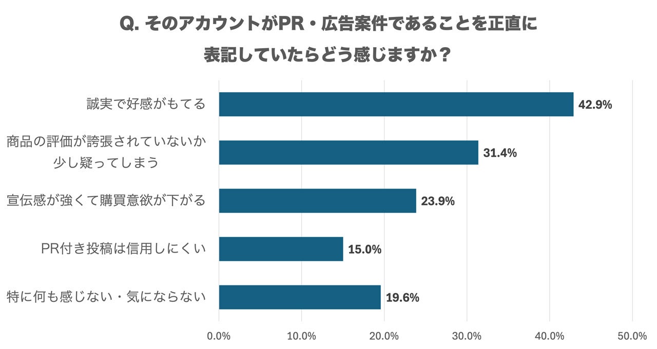 アカウント(企業やインフルエンサー)がPR・広告案件であることを正直に表記していた場合の感じ方については、「誠実で好感がもてる」(42.9%)が最も多く、次いで「商品の評価が誇張されていないか少し疑ってしまう」(31.4%)、「宣伝感が強くて購買意欲が下がる」(23.9%)という結果でした。「PR付き投稿は信用しにくい」(15.0%)や「特に何も感じない・気にならない」(19.6%)という回答も見られました。