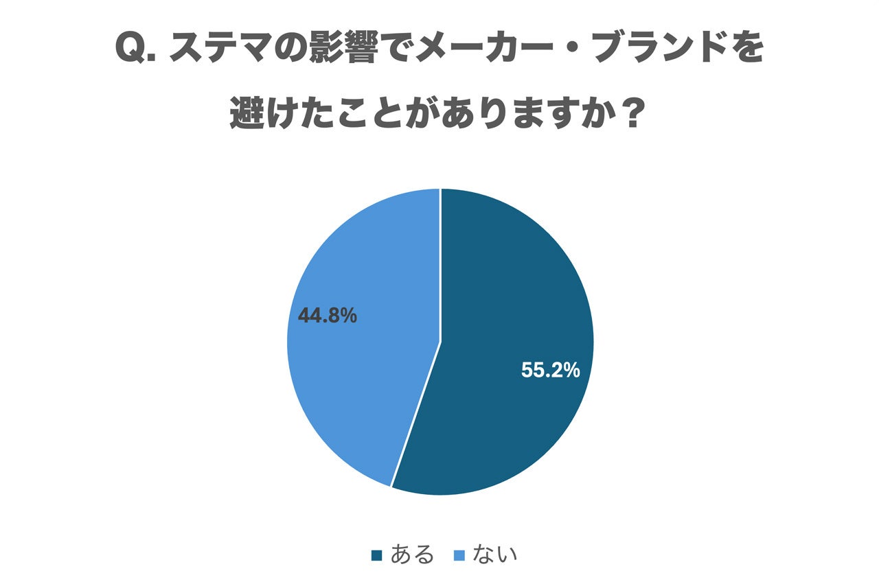 ステマの影響でその商品やサービスを提供しているメーカー・ブランドを避けたことがあるかという質問には、「ある」と回答した人が55.2%、「ない」と回答した人が44.8%でした。この結果から、ステマを依頼した商品やサービスだけでなく、同じ企業が提供する他の商品・サービスの売上にも悪影響を及ぼす可能性があることが示唆されています。