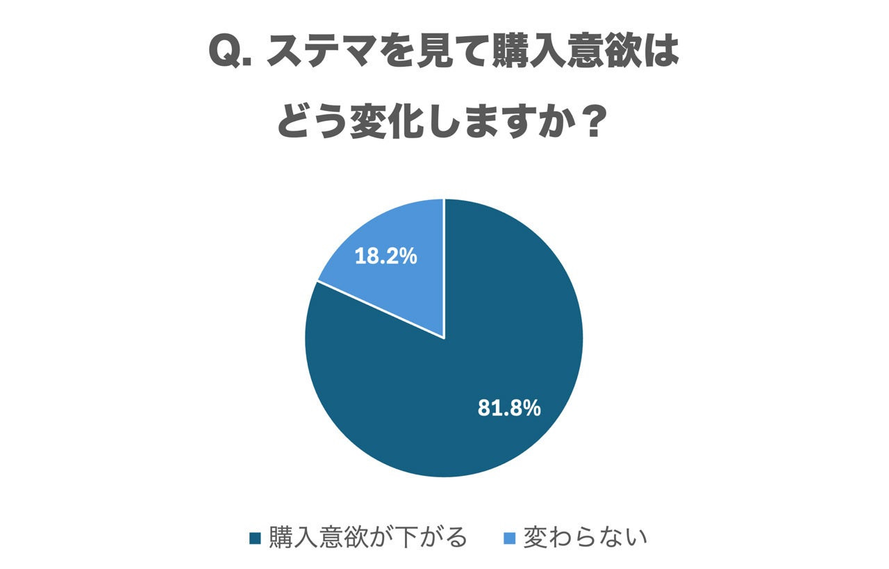 ステマを見た後の購入意欲の変化については、「購入意欲が下がる」と回答した人が81.8%と圧倒的多数を占めています。「購入意欲が上がる」と回答した人は0.0%、「変わらない」は18.2%でした。