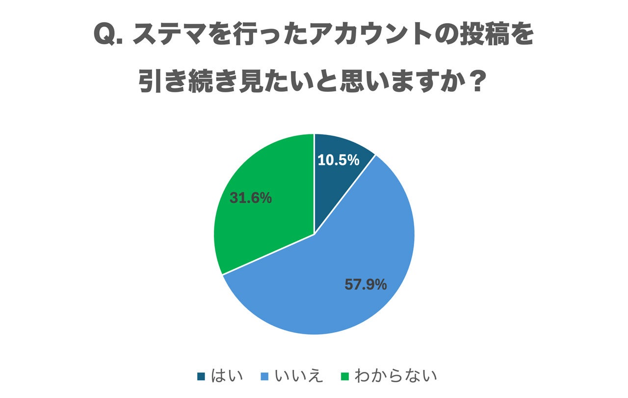 さらに、ステマを行ったアカウントの投稿を引き続き見たいかという質問に対しては、「いいえ」と回答した人が57.9%と過半数を占め、「はい」は10.5%、「わからない」は31.6%でした。これらの結果から、ステマ行為はフォロワーやファンの印象を悪化させ、継続的な視聴率にも悪影響を与える可能性が高いことが示唆されています。