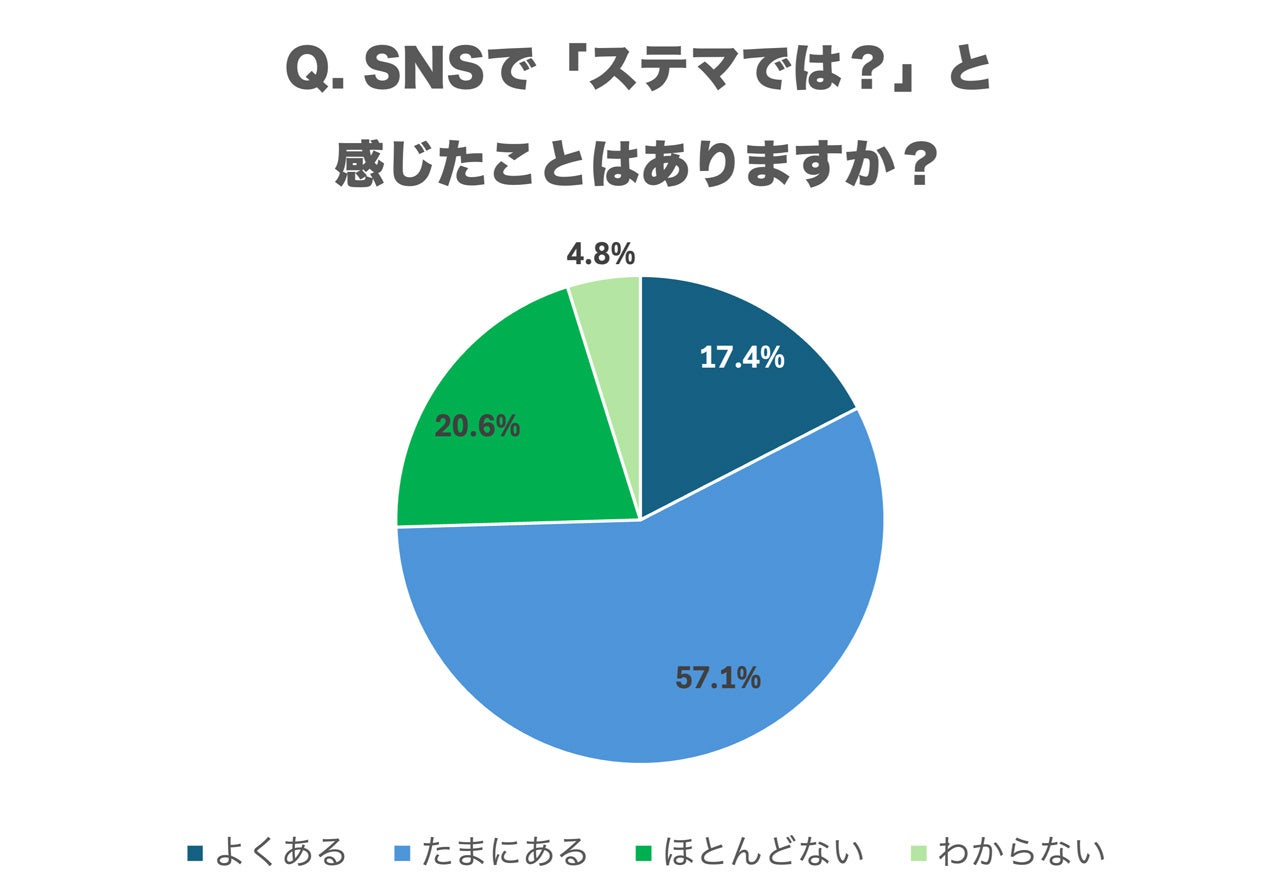 SNSで「ステマでは?」と感じた経験については、「よくある」(17.4%)と「たまにある」(57.1%)を合わせると、74.5%の回答者がステマを感じた経験があることが明らかになりました。「ほとんどない」と回答した人は20.6%、「わからない」は4.8%となっています。