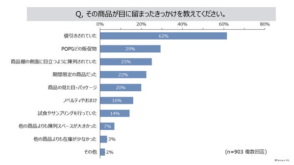 - 買う予定がなかったが、店内で見て買おうと決めた商品がある90%、目に留まったきっかけは「値引きされていた」