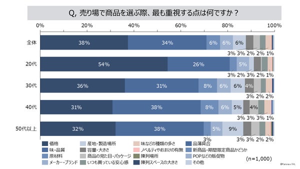 興味深いことに、年代別の分析では年齢が上がるにつれて「価格」重視の傾向が弱まり、代わりに「味・品質」を重視する傾向が強まることが判明しました。特に40代以上の消費者は「味・品質」を最も重視する傾向にあるようです。
