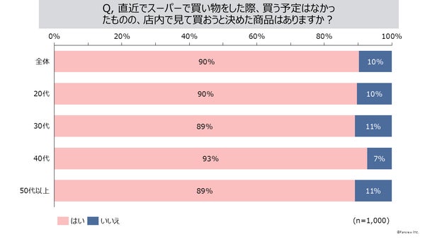 さらに注目すべき点として、直近のスーパー買い物時に、当初購入予定になかった商品を店内で見て買うことを決めた「衝動買い」の経験がある消費者は全体の90%に上ることが判明しました。この結果は、計画的に買い物をする消費者でさえも、店内での発見によって購入決定が左右されることを示しています。