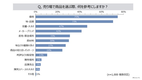 1.商品を選ぶ際に参考にするのは「価格」と「味・品質」、最も重視するのは「価格」