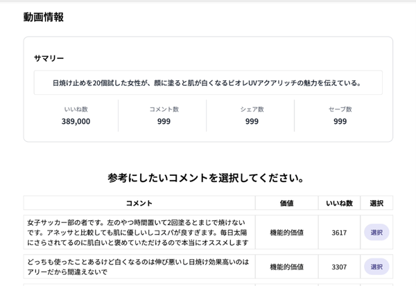 選定したコメントと入力する商品・サービスの情報に基づき、自動で動画企画案を生成します。