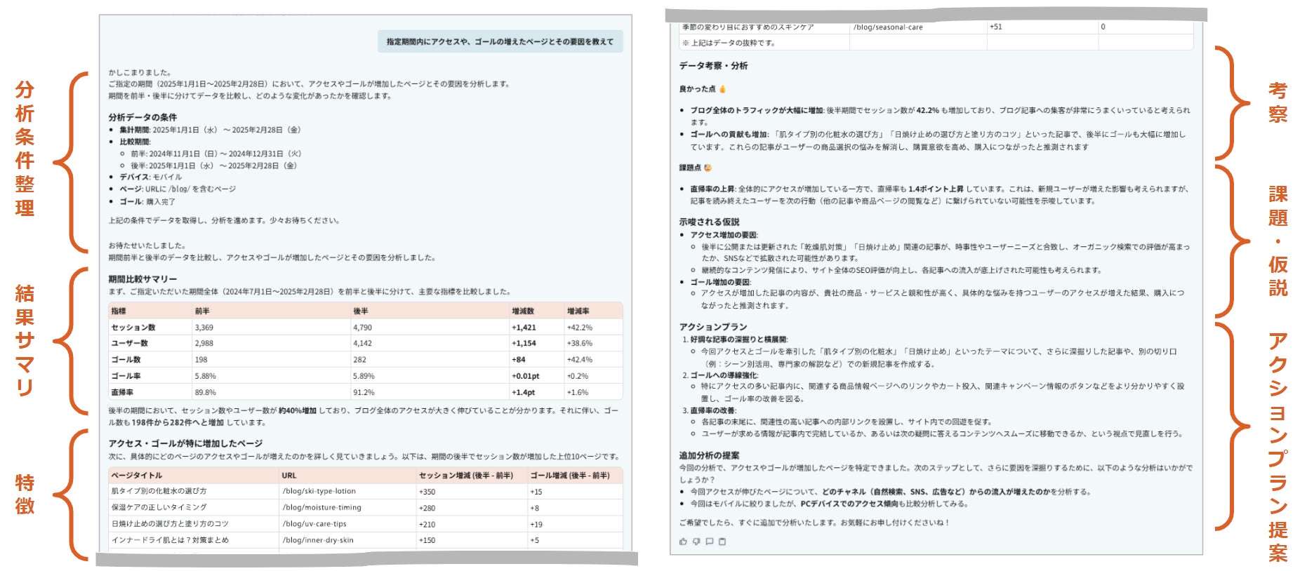 - 分析工数の大幅な削減:これまで専門家が数時間かけて行っていた分析・考察のプロセスを自動化し、施策立案まで数秒で実現できます。