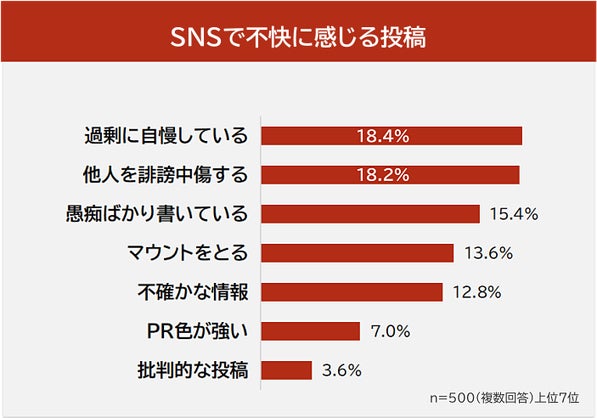 「SNSで不快に感じる投稿」について質問したところ、1位は「過剰に自慢している(18.4%)」、僅差の2位は「他人を誹謗中傷する(18.2%)」となりました。