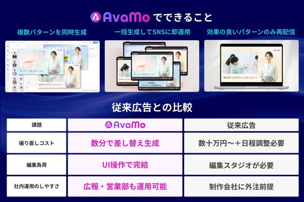 従来の動画広告制作では、企画からキャスティング、撮影、編集、納品、効果検証といった工程が分断されており、クリエイティブの改善には多大なコストと時間がかかる非効率な構造が課題となっていました。「AvaMo」は、AIタレントを用いることで動画広告のPDCAを高速で実施できる、全く新しい広告運用モデルを実現するとのことです。