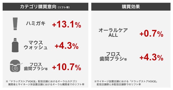 『ドラッグストアVOICE』では、オーラルケアやスキンケアにまつわるトークコンテンツを2025年2月1日〜4月30日に期間限定で配信(PoC:Proof of Concept/概念検証)されました。この実証実験の結果、オーラルカテゴリにおける購買意向は、ハミガキで13.1%増、マウスウォッシュで4.3%増、フロス・歯間ブラシ等で10.7%増となりました。また購買効果については、フロス・歯間ブラシ等で4.3%増、オーラルケアカテゴリ全体では0.7%増という成果が得られています。