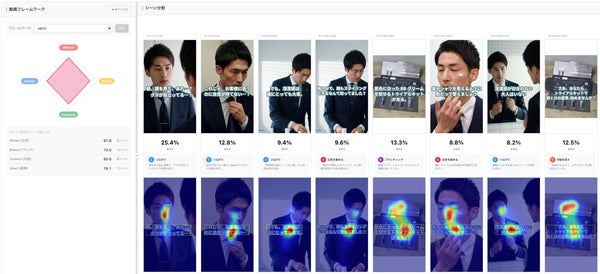 各シーンの指標予測スコアへの寄与度を予測し、全体を100%とする際の重要度を算出します。また、人間の目線を想定したヒートマップで目立っている箇所を可視化し、コピーに注視点が向いているかの注視度をスコア化します。