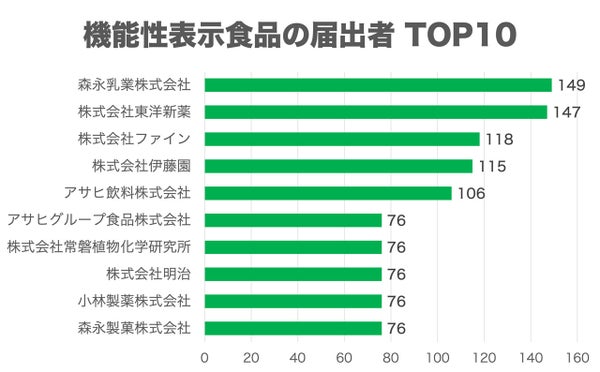 大手食品・飲料メーカーが上位を占める中、OEMを手がける企業も上位にランクインしており、機能性表示食品市場の多様性を反映しています。