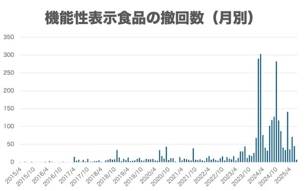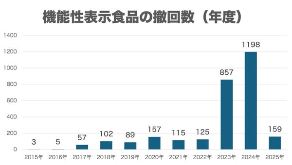 機能性表示食品の撤回状況に目を向けると、2023年度から急激に撤回数が増加し、2024年度も多くの商品が撤回となっています。統計によれば、約30%の商品が撤回されており、市場の流動性の高さを示しています。