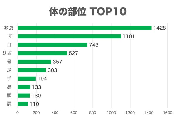 「お腹」が最も多く、内臓脂肪や腸内環境に関する機能性食品が人気であることを示しています。次いで「肌」が多く、美容への関心の高さが反映されています。また、「目」「ひざ」「骨」などの部位も上位にランクインしており、現代人の健康意識の多様化が見て取れます。