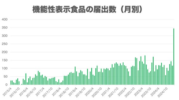 機能性表示食品の年度別・月別の推移を見ると、2024年度は特に最終月に届出数が大きく増加し、これまでで最多の届出数を記録しました。このことから、機能性表示食品への関心と市場の成長が継続していることがうかがえます。