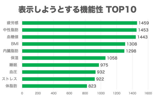疲労感や中性脂肪、血糖値など、現代人の生活習慣と密接に関わる機能性が上位を占めていることがわかります。特に、メタボリックシンドロームに関連する項目(中性脂肪、血糖値、BMI、内臓脂肪など)が多く、健康意識の高まりとともに、これらの機能性への関心が高まっていることが示唆されます。