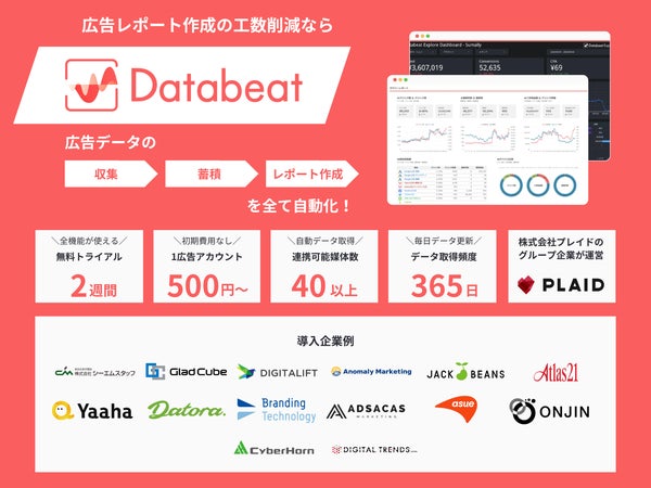 アジト株式会社が開発・提供する広告レポート自動化ツール「Databeat」は、合計40以上の広告媒体や計測ツールと連携し、データの収集から蓄積、レポート作成までを自動化できるサービスです。