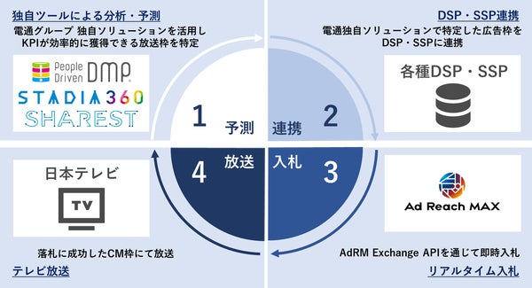 また、国内電通グループが保有する独自ソリューションと「AdRM Exchange」を連携させることで、テレビ広告出稿の高度な効果検証を実現し、より効率的なテレビ広告のプランニングと運用を可能にするとのことです。