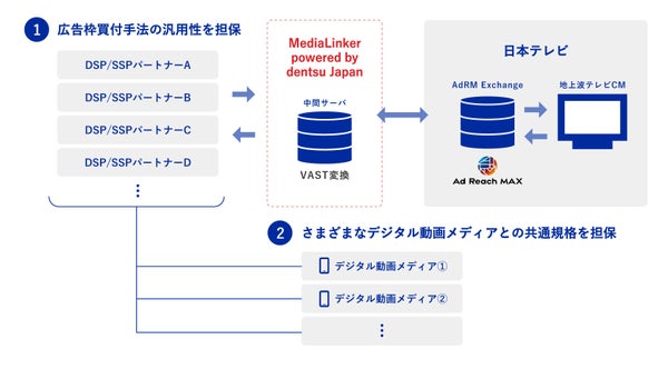 さらに、「AdRM Exchange」と各DSP/SSPパートナーを、CARTA ZEROが開発した中間サーバ「MediaLinker powered by dentsu Japan」で接続することにより、デジタル動画広告の標準規格である「VAST」(Video Ad Serving Template)に変換し、放送局と各パートナーとの接続コスト低減を実現するとしています。