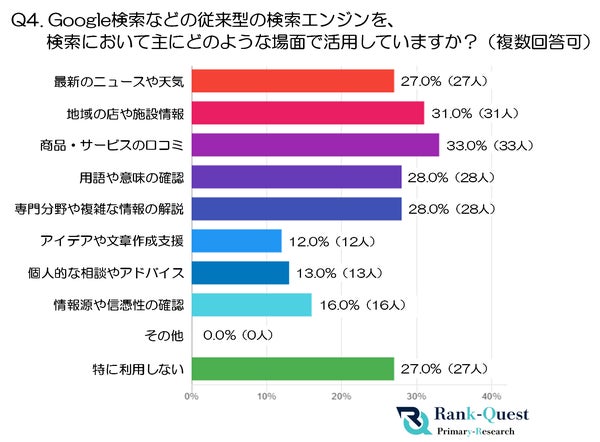 - 従来型検索エンジンの活用場面として最も多かったのは「商品・サービスの口コミ」で33.0%(33人)にのぼりました。次いで多かったのは「地域の店や施設情報」で31.0%(31人)でした。