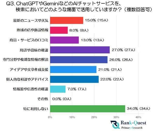 - 一方で「情報源や信憑性の確認」(7.0%、7人)は少数派にとどまり、情報の信頼性そのものをAIに委ねる姿勢はまだ一般的ではないようです。