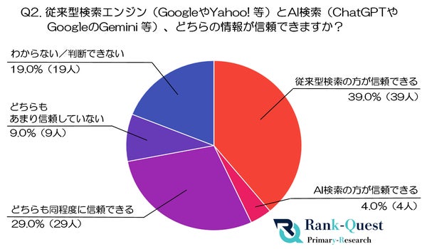 - 次に多かったのは「どちらも同程度に信頼できる」という回答で29.0%(29人)でした。この結果は、従来型検索とAI検索それぞれの特性を理解し、用途や状況に応じて両方のツールを適切に信頼して活用しているユーザーが一定数存在することを示しています。