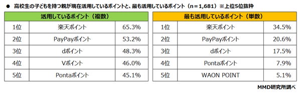 ・高校生の親が最も活用している共通ポイントは「楽天ポイント」、次いで「PayPayポイント」「dポイント」
