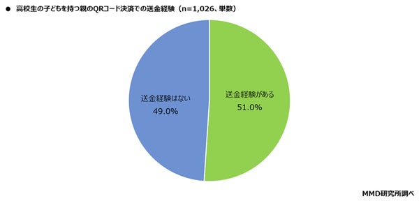 高校生の子どもを持つ親でQRコード決済を利用している1,026人に対して、直近半年の送金機能の利用経験を質問したところ、51.0%が「送金経験がある」と回答していることがわかりました。これは高校生の送金経験率(34.7%)よりも高い数値を示しています。