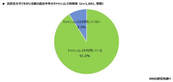 高校生の親の直近半年のキャッシュレス利用率は91.0%、QRコード決済は61.0%