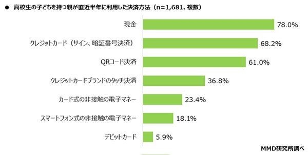 MMD研究所調査:高校生の62.1%、親の91.0%がキャッシュレス決済を利用、QRコード決済での家族間送金も普及