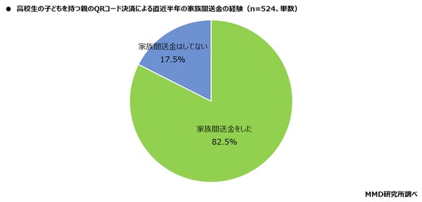 さらに、直近半年で送金経験があると回答した524人に対して、家族間送金の利用経験を質問したところ、82.5%が「家族間送金をした」と回答しています。この結果は、高校生の親世代においてもQRコード決済の送金機能が家族間のやり取りに広く活用されていることを示しているとのことです。