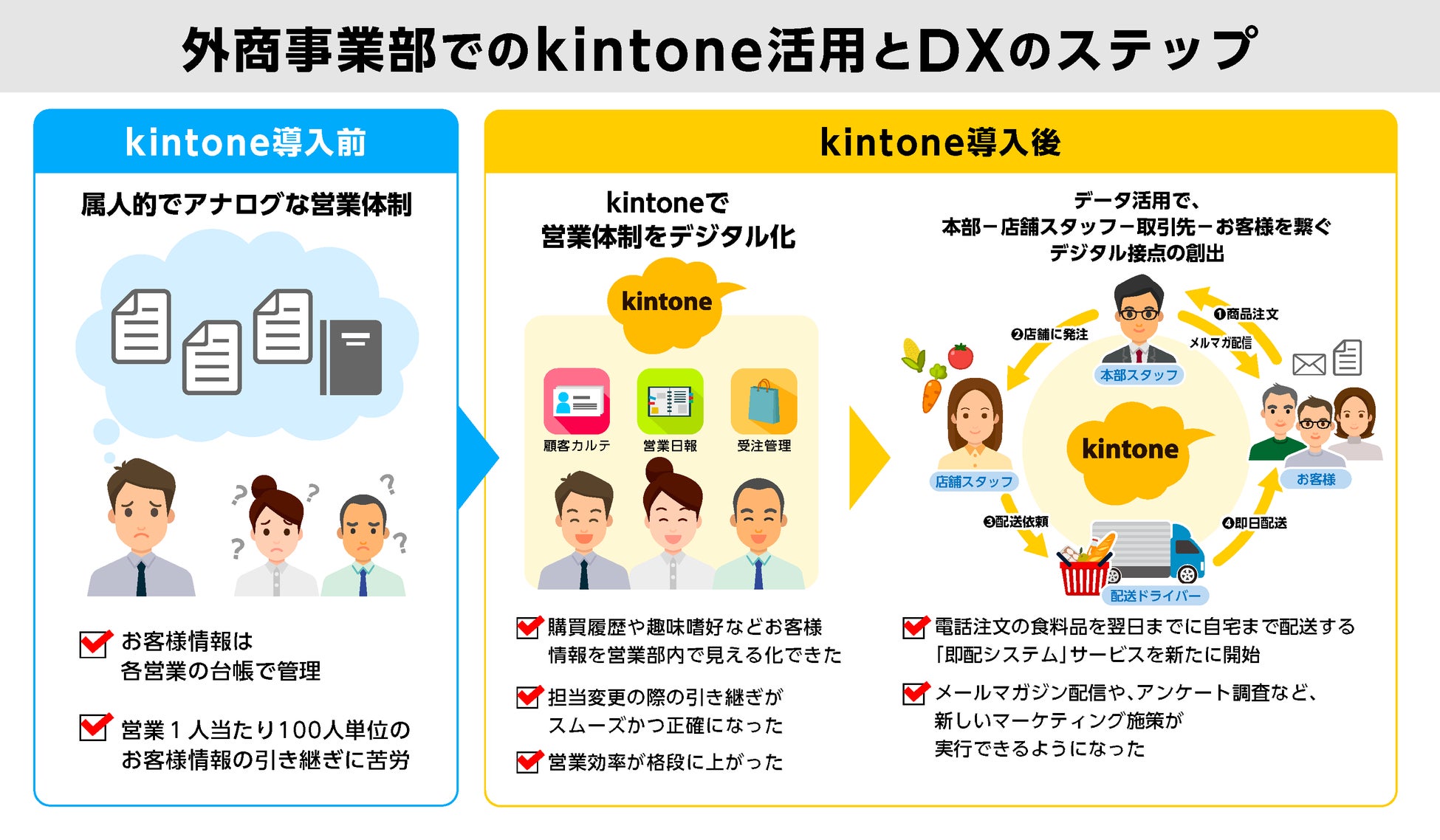 その問いに対する私たちの答えはシンプルです。 「kintoneを使うこと」が目的ではなく、「最適な選択肢として選んだ結果」ということ。