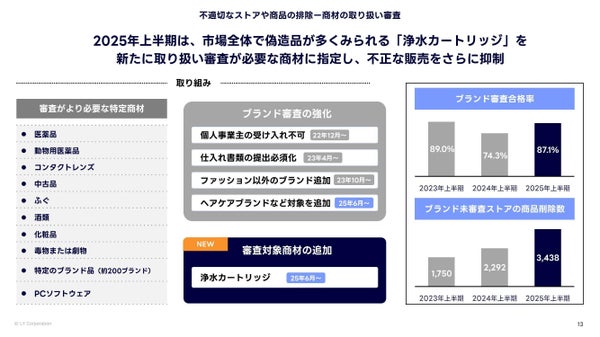 商材の取り扱い審査においては、2025年上半期から偽造品が増加傾向にある「浄水カートリッジ」が新たに審査対象商材に追加され、不正な販売行為の抑制に取り組まれています。