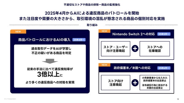 また、2025年上半期には、政府備蓄米やNintendo Switch 2など、注目度や需要の高さから取引環境の混乱が懸念される商品に対して個別の対応が実施されました。これにより、ユーザーが安心して商品を購入できる環境の維持に努められています。