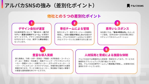 同社は「認知のタイミングで質の高いSNS運用に触れることが、結果的に購買につながる」という考えのもと、各プラットフォームの特性を活かした「良いコンテンツ」を"高品質"に提供することに価値があるとしています。