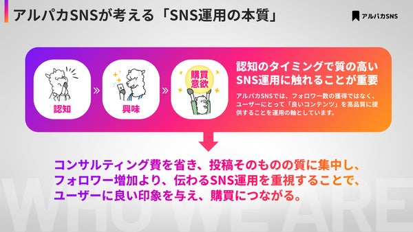 各プラットフォームの特性は異なりますが、アルパカSNSの根本的な考え方は変わらないということです。SNSアカウント運用は、ユーザーの「認知→興味→購買意欲」を獲得するものであり、フォロワー数を増やすだけのものではないという考え方を持っています。