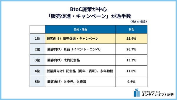 ポイント1:販売促進・キャンペーンが55.4%と首位、続いて景品での活用が26.7%