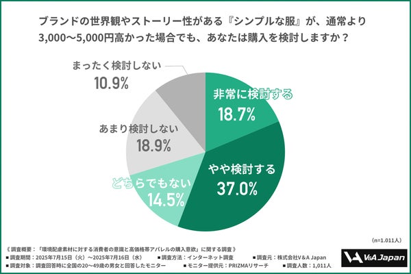 「ブランドの世界観やストーリー性がある『シンプルな服』が、通常より3,000〜5,000円高かった場合でも、あなたは購入を検討するか」という質問に対して、以下のような回答結果となりました。