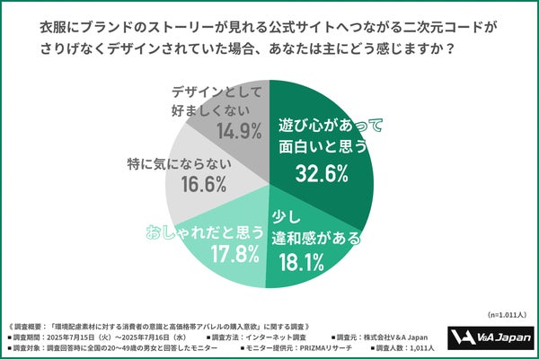 「衣服にブランドのストーリーが見れる公式サイトへつながる二次元コードがさりげなくデザインされていた場合、あなたは主にどう感じるか」という質問に対して、『遊び心があって面白いと思う(32.6%)』が最多で、『少し違和感がある(18.1%)』『おしゃれだと思う(17.8%)』と続きました。