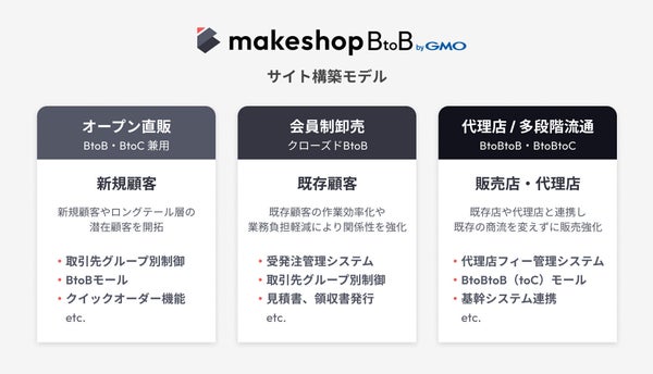 このサービスは、従来の「makeshop byGMO」で提供されていたBtoB関連機能を統合・強化したソリューションです。「オープン直販」「会員制卸売」「代理店/多段階流通」といった様々なビジネスモデルに対応し、企業の規模に合わせた拡張性を備えることで、BtoB-ECにおける企業のDX戦略を強力にサポートするとのことです。