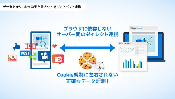 「Squad beyond」はこのポストバック機能を標準で提供し、この課題解決を推進してきました。Cookie規制に左右されない正確なデータ連携はもちろん、外部ツールのデータを活用した媒体学習の促進、ASP連携時のCVタグ設置不要などを通じて、計測工数の抜本的削減と広告成果の最大化を同時に実現するとしています。
