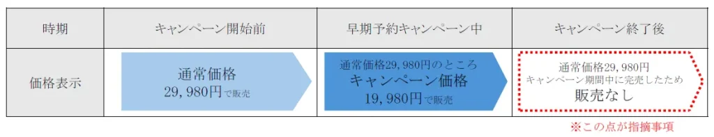 対象は、2024年秋に実施したおせちの「早期予約キャンペーン」の価格表示です。通常価格29,980円を10,000円値引きし、19,980円で販売と表示するも、期間終了後に29,980円での販売実績がなく、結果的に「お得に見せかけた表示」となる可能性があると、消費者庁は指摘します。