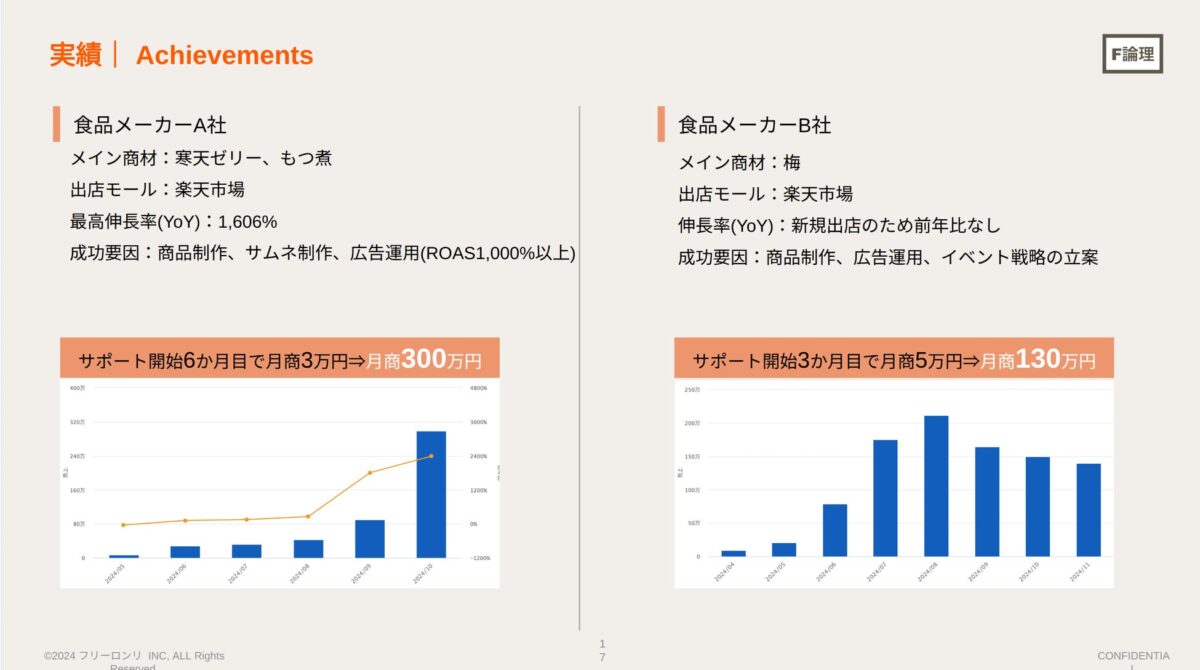 ホビー商品を主力とするおもちゃメーカーA社は、楽天市場への新規出店にあたり、株式会社フリーロンリの支援を受けました。同社は商品制作、サムネイル制作、イベント戦略立案などの領域でサポートを実施。その結果、支援開始からわずか7ヶ月目という短期間で月商650万円という印象的な成果を達成しています。