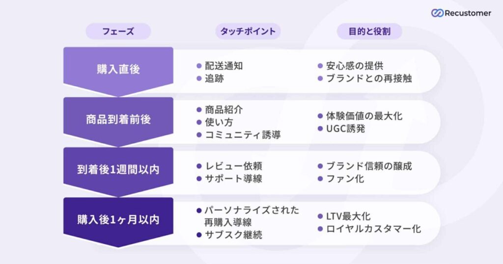 この概念は、単に「カスタマーサポートを強化する」という意味ではありません。配送通知や返品対応、レビュー収集、次回購入へのリマインドなど、購入後のタッチポイントをすべて「戦略的マーケティング」として再設計するものです。