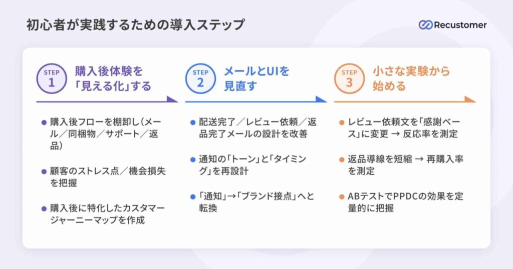 PPDCを導入するには、大規模なシステム開発やリブランディングが必要なわけではありません。以下の3ステップで段階的に始めることが可能です。