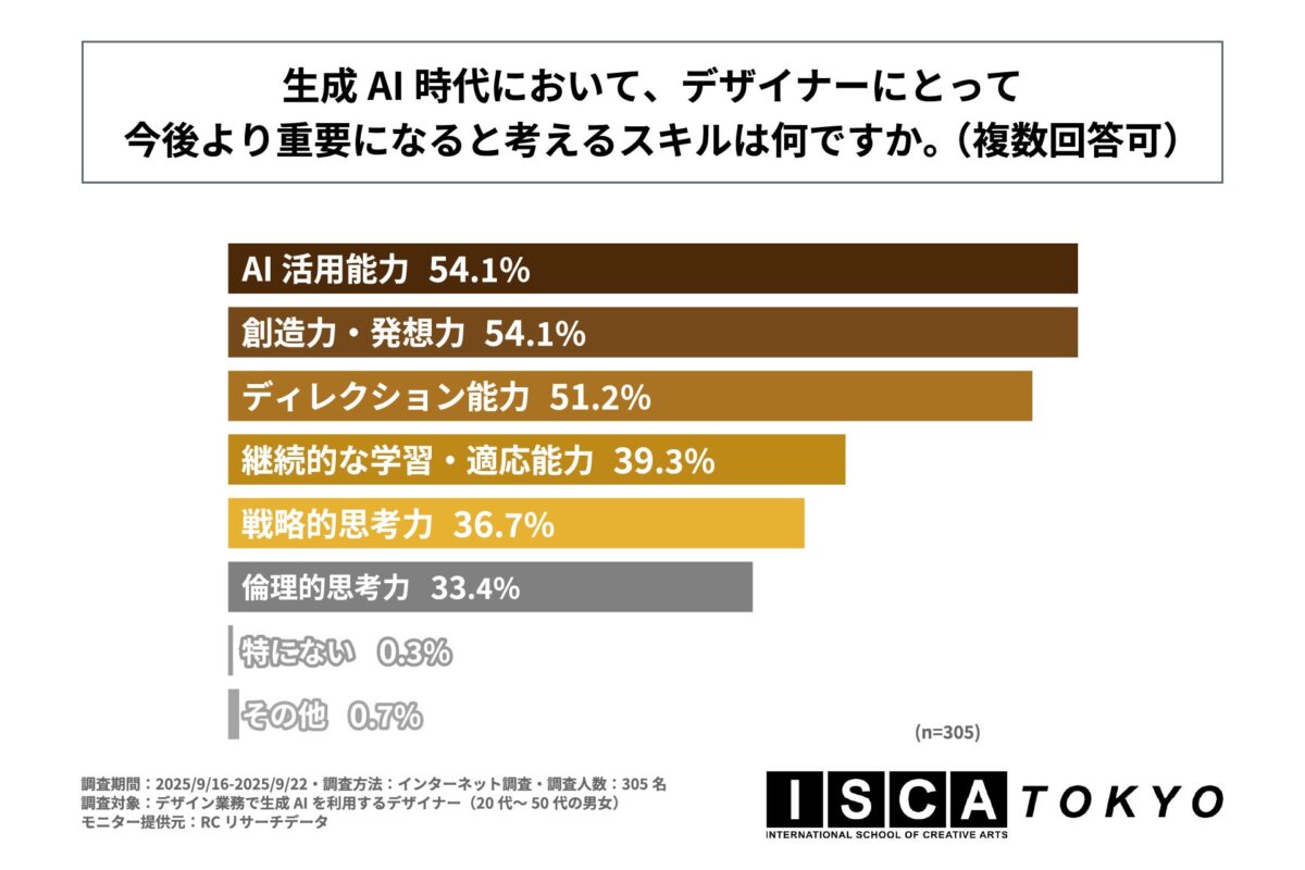 - デザイン業務で生成AIを利用するデザイナーが考える、生成AI時代において、デザイナーにとって今後より重要になるスキルは主に「AI活用能力」や「創造力・発想力」だとされています