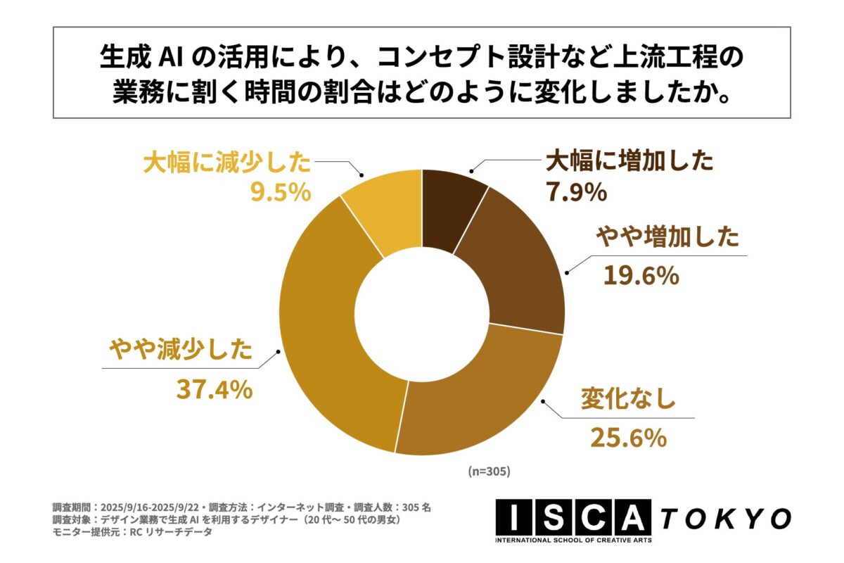 - デザイン業務で生成AIを利用するデザイナーの45%以上が、生成AIの活用により、コンセプト設計など上流工程の業務に割く時間の割合が少なからず減少したと感じているとのことです