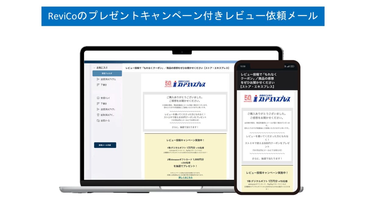 ReviCoの特徴としては、同社が費用・抽選・発送を全て負担し実施するプレゼントキャンペーン付きレビュー依頼メールの配信や、最短1ステップで投稿が完了する簡易な投稿フローにより、継続的にレビューを獲得できる点が挙げられます。
