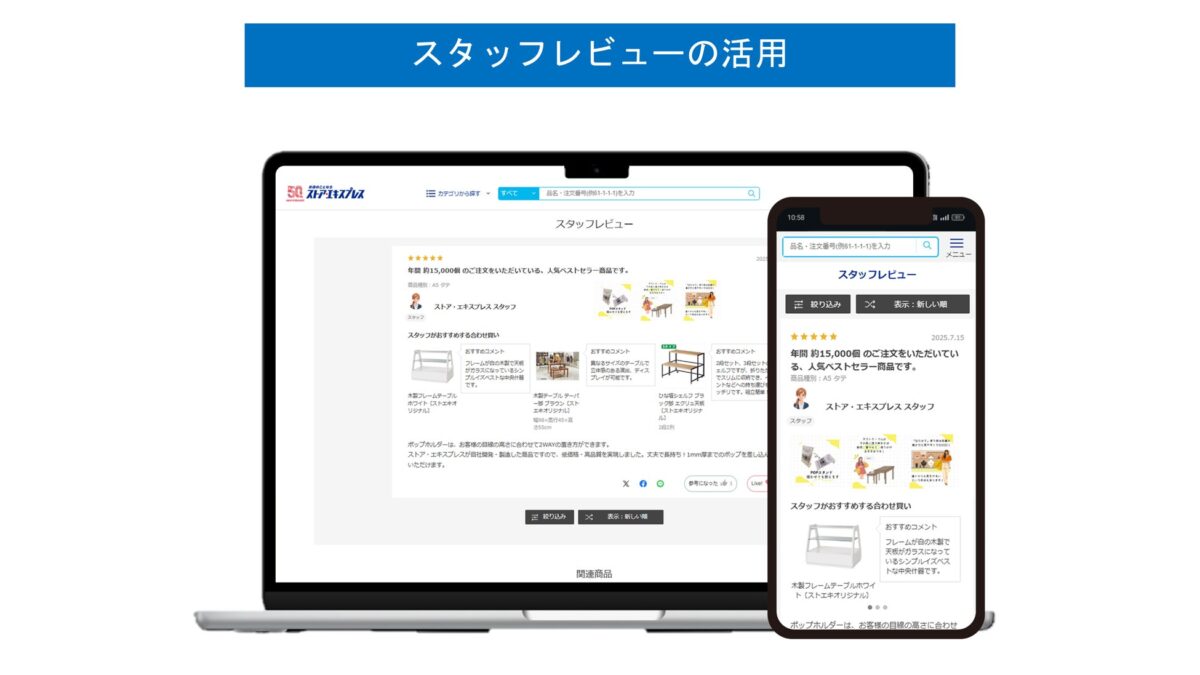 ・スタッフレビュー機能を活用し、商品の魅力をスタッフが簡単に投稿し商品ページに表示できるフローを確立