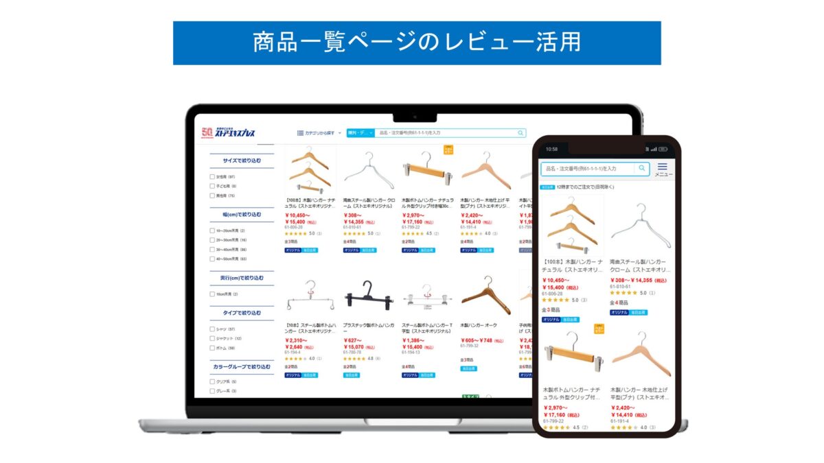 ・幅広い商品にレビューが集まり、カテゴリなどの商品一覧ページに商品毎の星評価や件数が埋まる状態を実現!